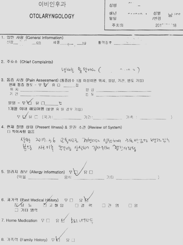 한**님은 무단횡단 사고로 정형외과적 치료를 받던 중 냄새를 못맡아 신경외과 진료로 2달간