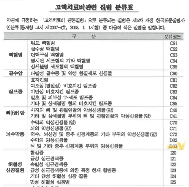 그러므로 여러 치료방법 및 현재상태 주치의의 소견서등의 서류를 종합적으로 판단하여 악성암에 준한다는 내용으로