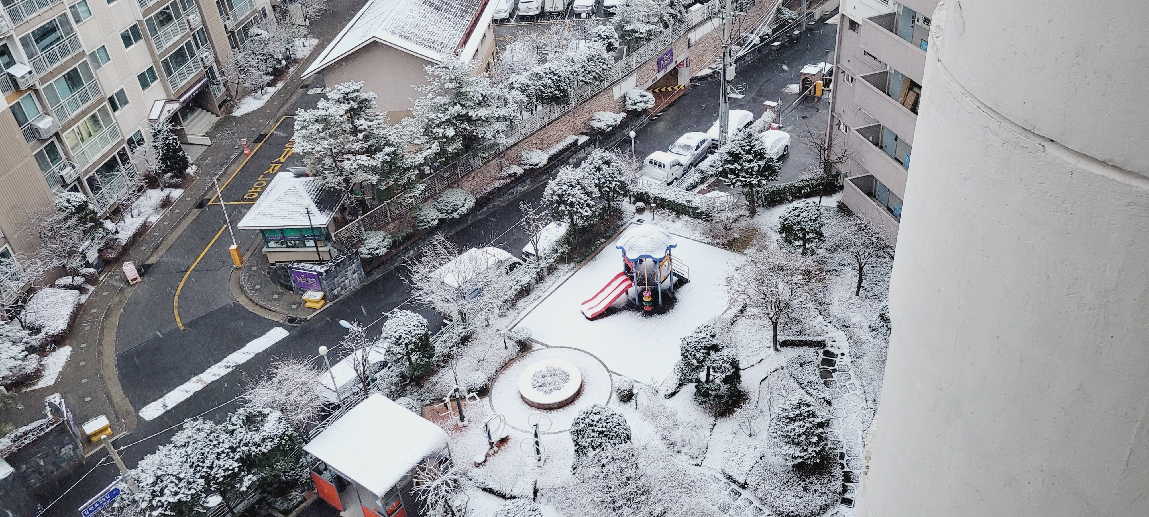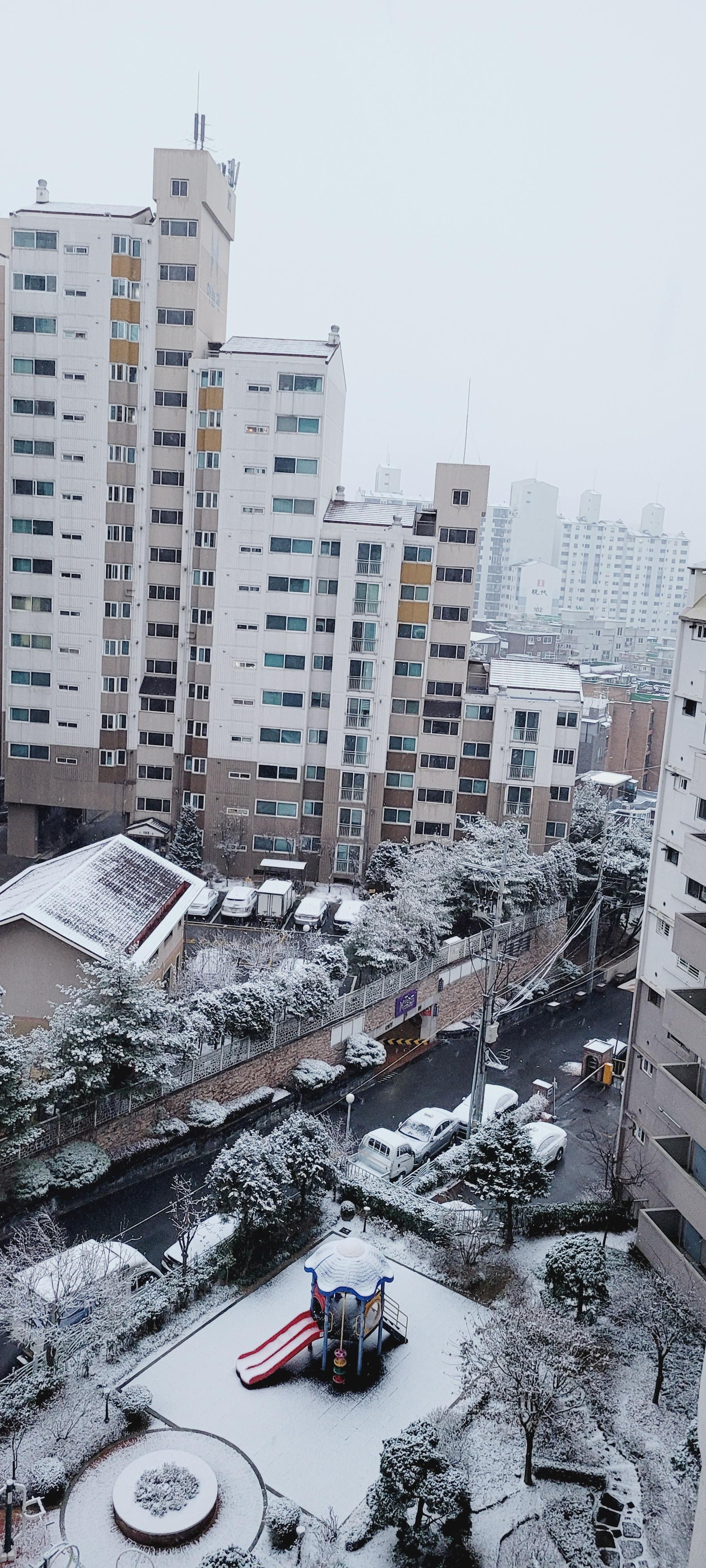 일요일 아침 조금 느즈막에 일어나 베란다 커튼을 치니 하얗게 쌓여있더라고요...