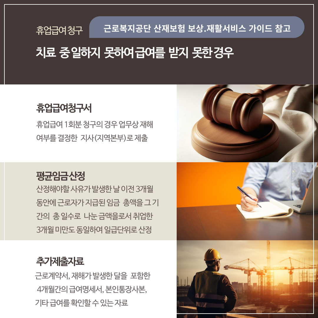 산재보상에서는 요양으로 이하여 취업하지 못한 산재근로자와 그 가족의 생활보호를 위하여 4일 이상의 요양(입원/통원)으로 취업하지 못한 기간에 대해 평균임금의 70%를 휴업급여로 지급합니다.