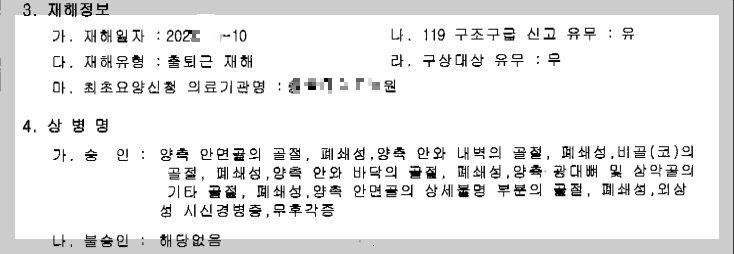 다음의 사례는 출퇴근 재해로 인정받아 산재처리 보상 즉, 요양비, 휴업급여, 장해급여 산재보상을 받고 재해자 본인이 가입한 자동차보험 자상(자동차상해)에서 보상이 된 사례입니다.