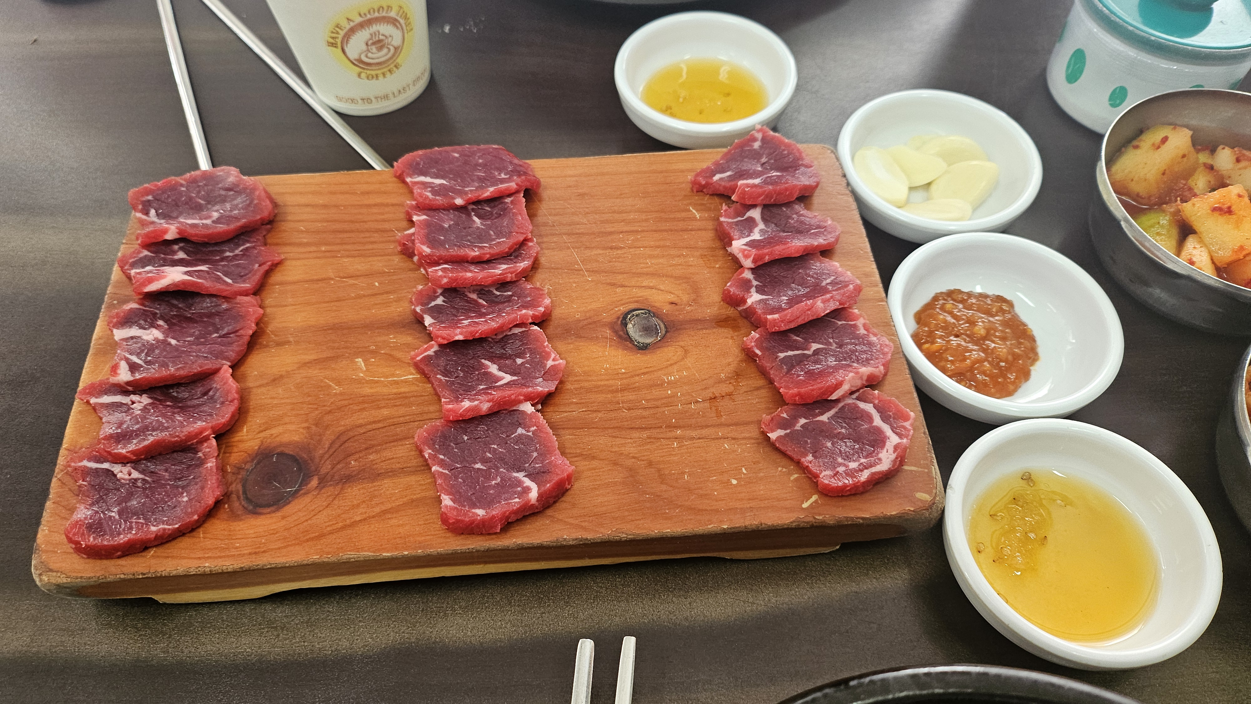들어와서 보니 사람들이 다 국밥이랑 육사시미를 먹고 있더라고요 그래서 저도 그냥 소국밥이랑 한우 육사시미(12,000원)을 시켜 먹었답니다. 육사시미를 찍어먹는 참기름이 정말 향이 강하고, 고소하답니다. 물론 국밥은 최고!!! 한그릇 뚝딱!!~