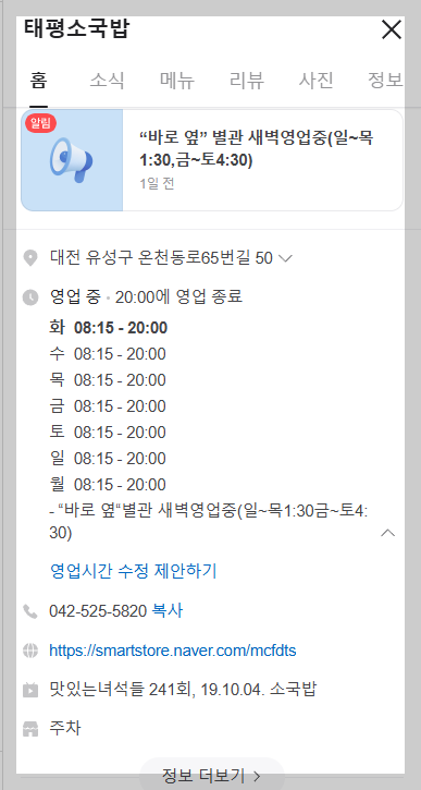 네이버에 대전 맛집을 검색하면 성심당과 함께 태평소국밥이 검색된답니다. 그런데 대전을 그렇게나 많이 방문해 놓고 이제서야 태평소국밥을 먹어보다니....ㅠㅠ 대놓고 맛집인데 이제 알고 가봤네요. 대전에 오면 꼭 먹어봐야 한다는 후기를 보고 바로 달려갔답니다. 이런 12시도 안되었는데 벌써 대기줄이 많아요. 하지만! 테이블회전이 빨라 많이 기다리지 않고 맛있는 국밥을 먹었어요~ 줄이 길다고 그냥 가지 마시고 꼭 먹어 보시길 바래요^^ 기대를 하고 가선지 처음 먹을 때는 그냥 소고기국밥이네 했는데.... 왜 자꾸 먹고싶고, 또 생각나고, 서울에서 다시 먹으러 갈까 고민 할 만큼 게속 생각나는 맛이랍니다. 아마 조만가 다시 갈 것 같아요~