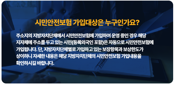 3.시민안전보험 가입대상은? -주소지의 지방자치단체에서 시민안전보험에 가입하여 운영 중인 경우 해당 지자체에 주소를 두고 있는 시민(등록외국인 표함)은 자동의 시민안전보험에 가입됩니다. 단, 지방자치단체별로 가입하고 있는 보장항목과 보상한도가 상이하니 자세한 내용은 해당 지방자치단체의 시민 안전보험 가입내용을 확인하시기 바랍니다.