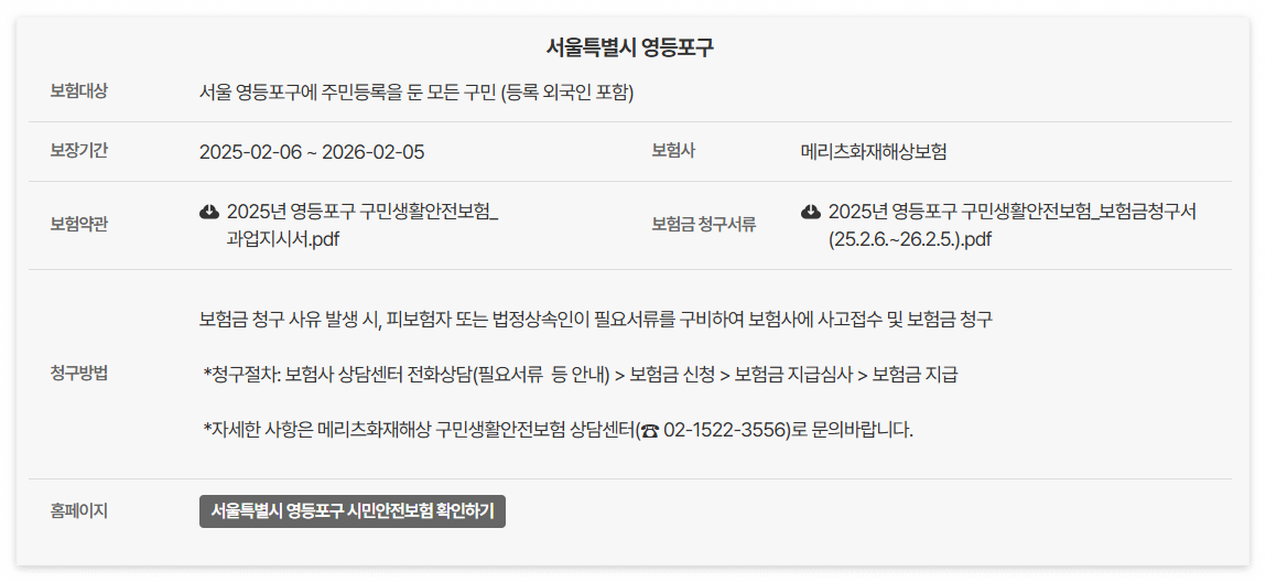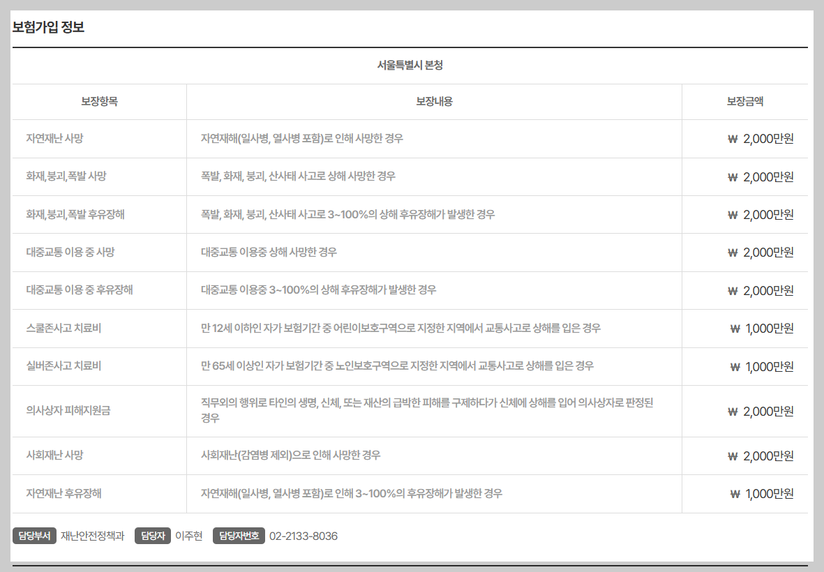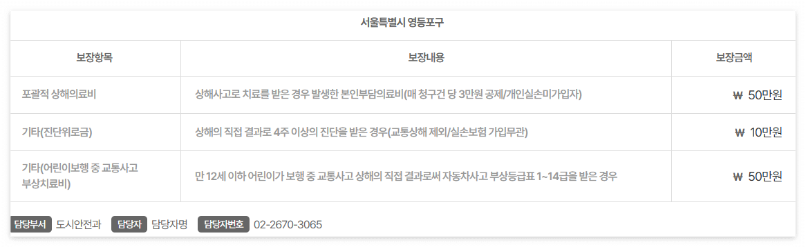 다음의 (예)는 서울시와 서울시 영등포구 시민안전보험의 보장내용입니다.