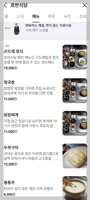 제천에 가면 꼭 가야하는 식당이 있지요~ 의림지 바로 근처에 있는 호반식당이랍니다^^ 곤드레나물, 된장, 청국장, 두부, 반찬 모두모두 맛있어요~~ 항상 청국장을 먹을지 된장찌개를 먹을 지 많이 고민을 하지만, 무엇을 먹어도 다 맛있답니다^^