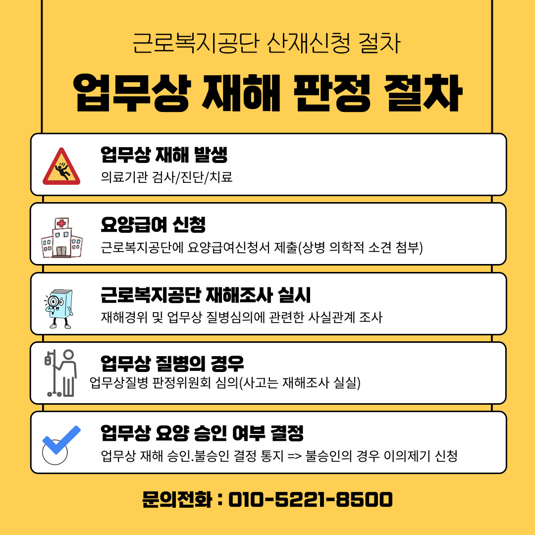 | 산재신청 | 업무상 질병인정 / 업무상 사고 인정 / 평균임금 정정신청 / 업무상재해사고 과실 / 중복보상여부 검토(개인보험) |