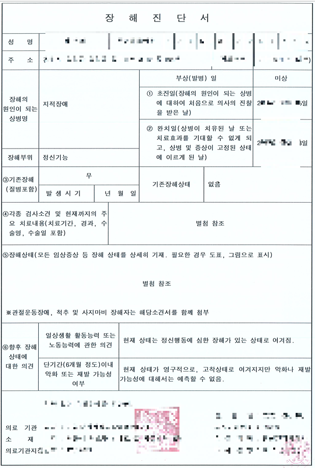 | 60점 이하 | -정신행동에 약간의 장해를 남긴 때 장해판정 직전 1년이상 지속적인 정신건강의학과의 치료를 받았으며 보건복지부고시 [장해등극판정기준]의 “능력장해측정기준” 6개 항목 중 2개 항목 이상에서 독립적 수행이 불가능하여 타인의 도움이 필요하고 GAF 60점 이하인 상태를 말한다. |